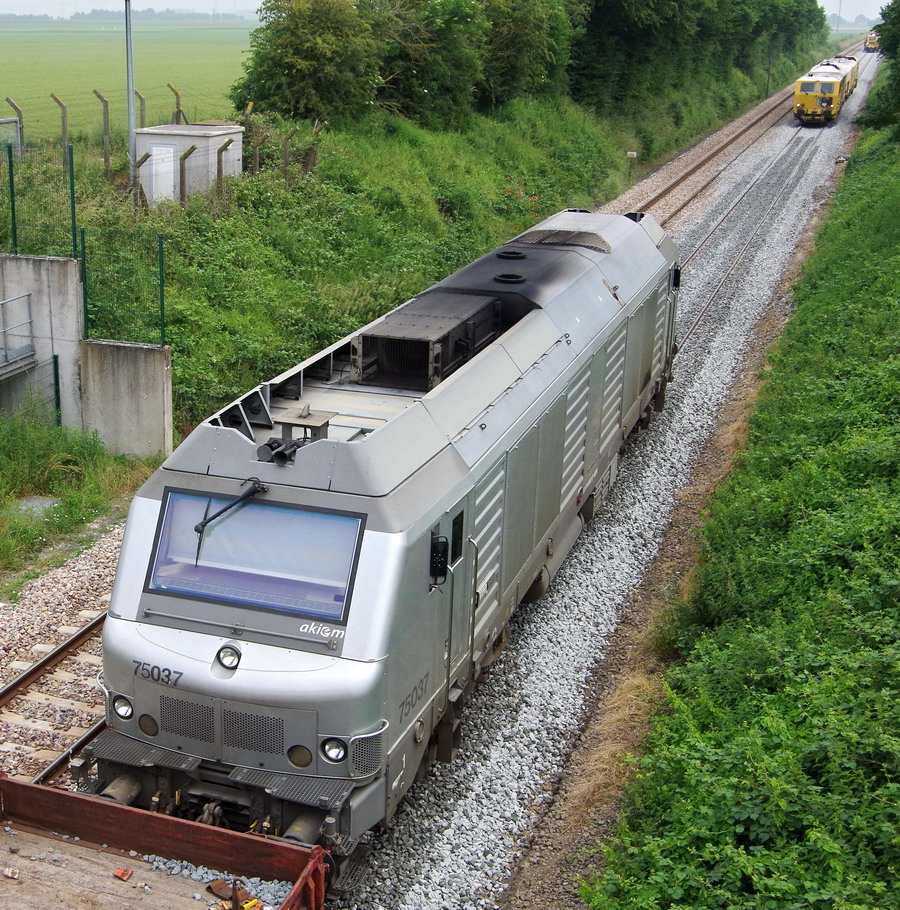La BB 75037 mise en service le 27-07-2007 pour Fret SNCF en livrée verte puis propriétaire d'AKIEM en livrée grise