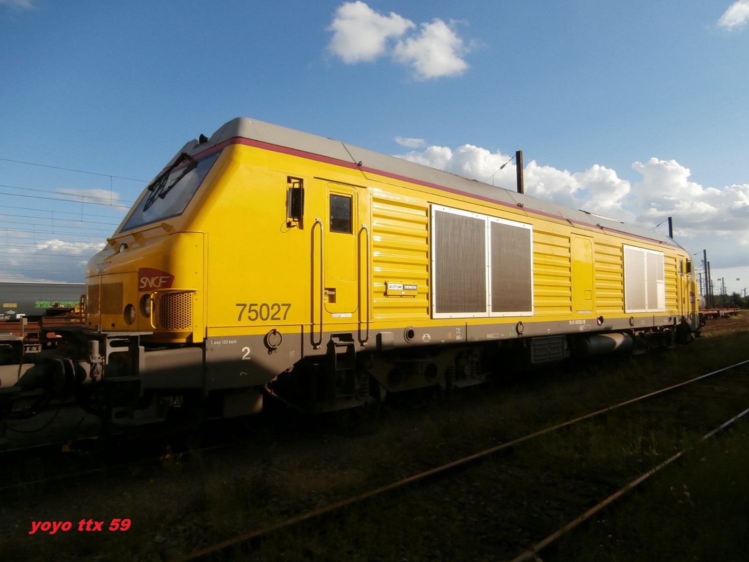 Vue hier au dépôt d'Achères, la BB 75027 vient de se voir appliquer une livrée jaune.