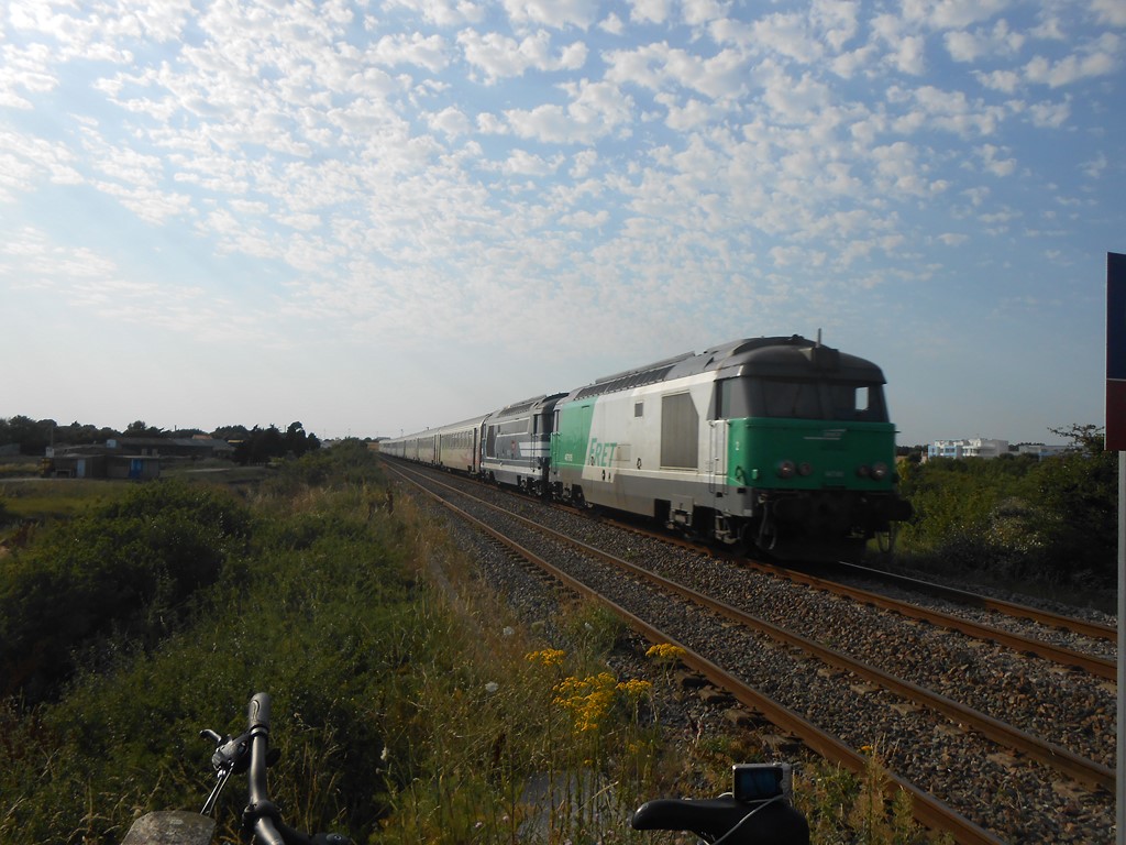 Voici la 467505 Infra en livrée Fret avec une rame de traverses à Saint Pierre des Corps pour l'Ouest mardi 01 avril 2014 à 15h32