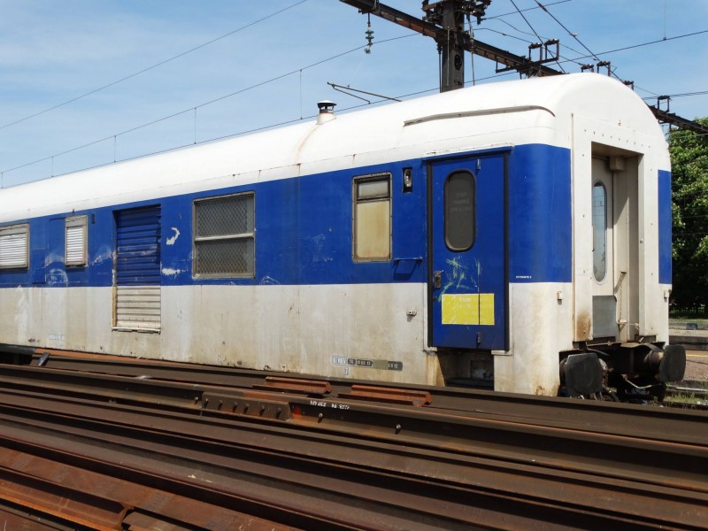 Voici la voiture de cantonnement 80 87 979 3 008-4 Uas H55 0 - F SNCF-MN (ex B5Dd2 UIC 50 87 82 70) avec le wagon de contôle