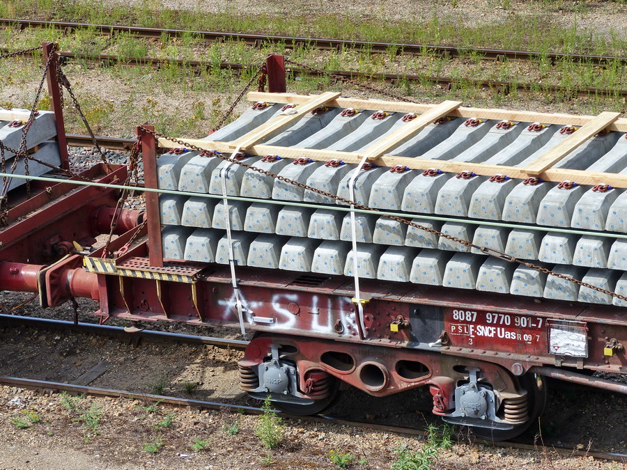 Voici le wagon 80 87 977 0 901-7 Uas R09 7 F SNCF-PSL Ã Saint Pierre des Corps le 16-09-2014 vide de chargement de traverses