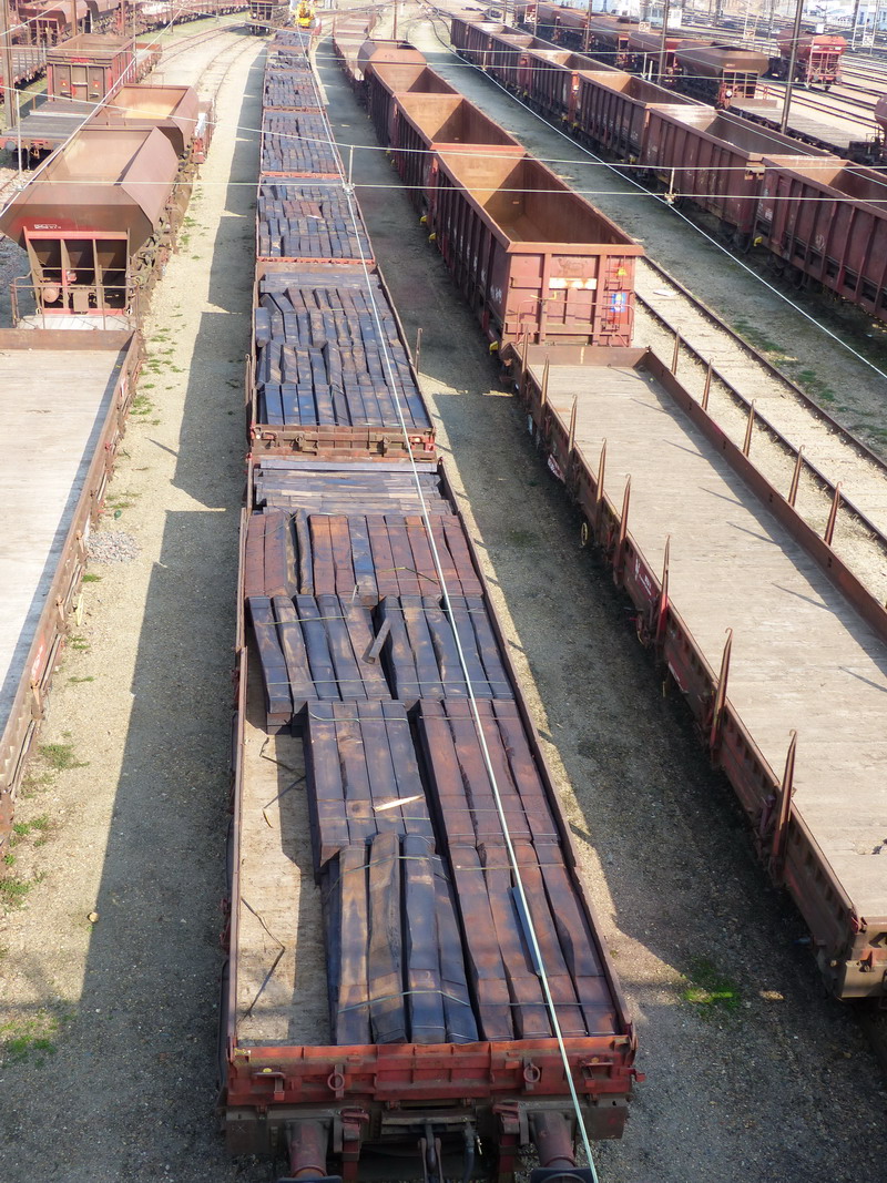 Voici le wagon plat à boggies 80 87 978 4 058-0 Uas - S39 2 - SNCF-PSL avec un chargement de traverses dans la zone de garage des rames