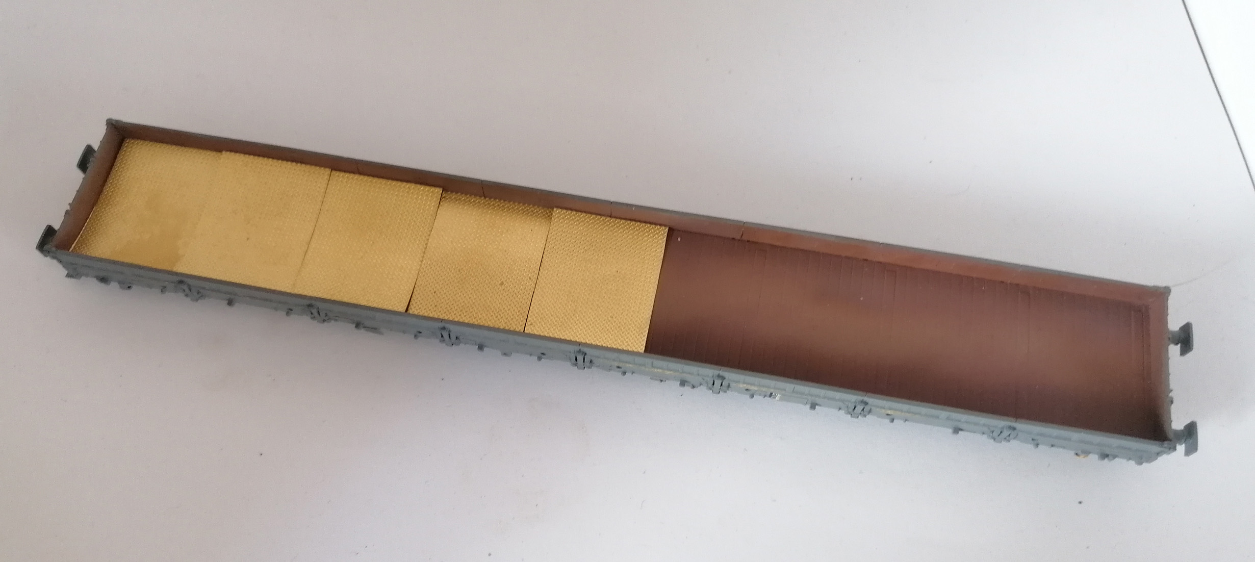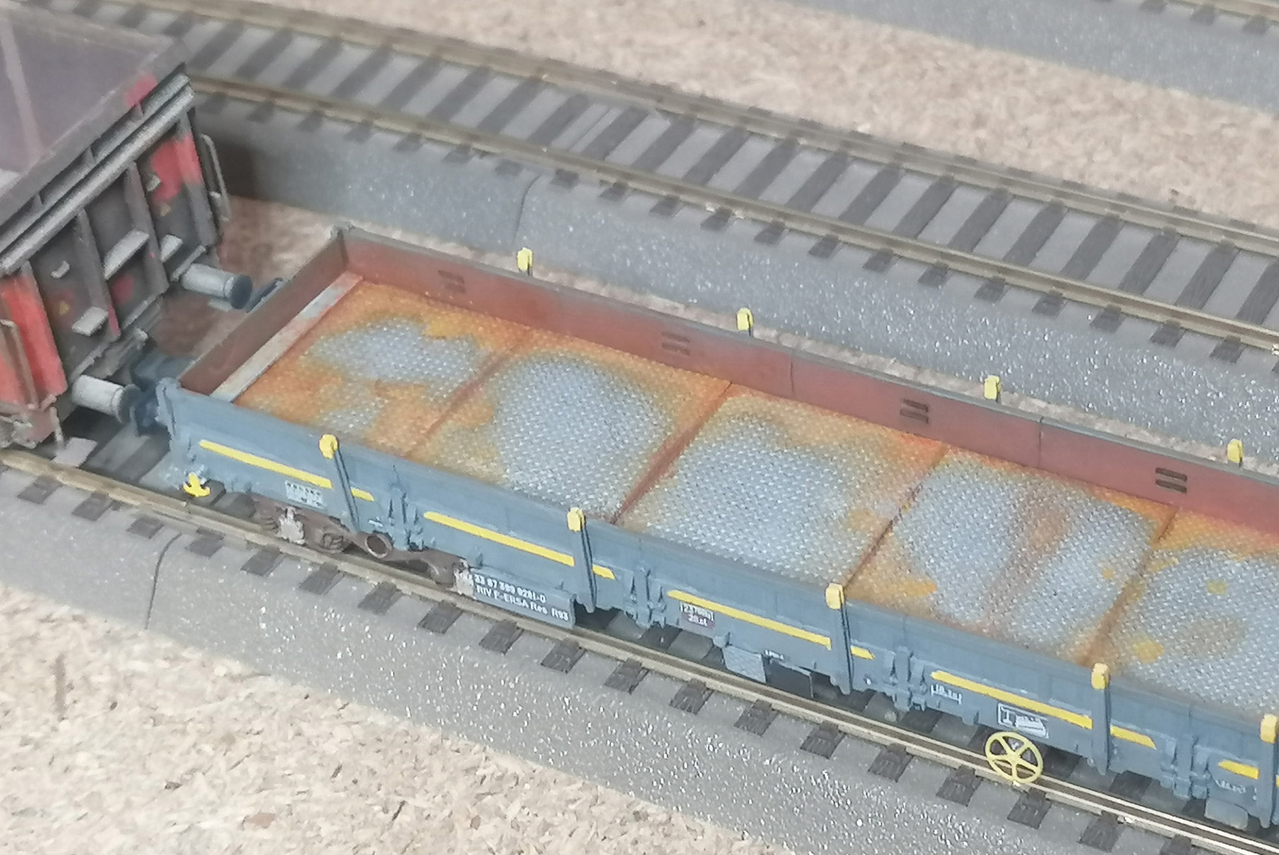 ce que j'ai remarqué c'est que les parois des modèles réels sont déformées par les chargements. Sur LR forum, Gonzo mettait de l'acétate pour produire cet effet. Je trouve que cela rends super en tout cas bien mieux que les parois bien lisses des wagons sortis de leur boite. De mon côté, je prends de la colle blanche que je tapote au pinceau pour être irrégulier. Avec un cure dent on peut donner aussi l'impression de traces faites par un godet de pelle mécanique. En même temps (avant que la colle prenne) après je rajoute le rust terxture pour qu'il soit collé lors du séchage. C'est un produit qui fait des effets grumeleux. On peut prendre aussi à mon avis des terres à décor. C'est du bidouillage, mais ça rends pas trop mal.