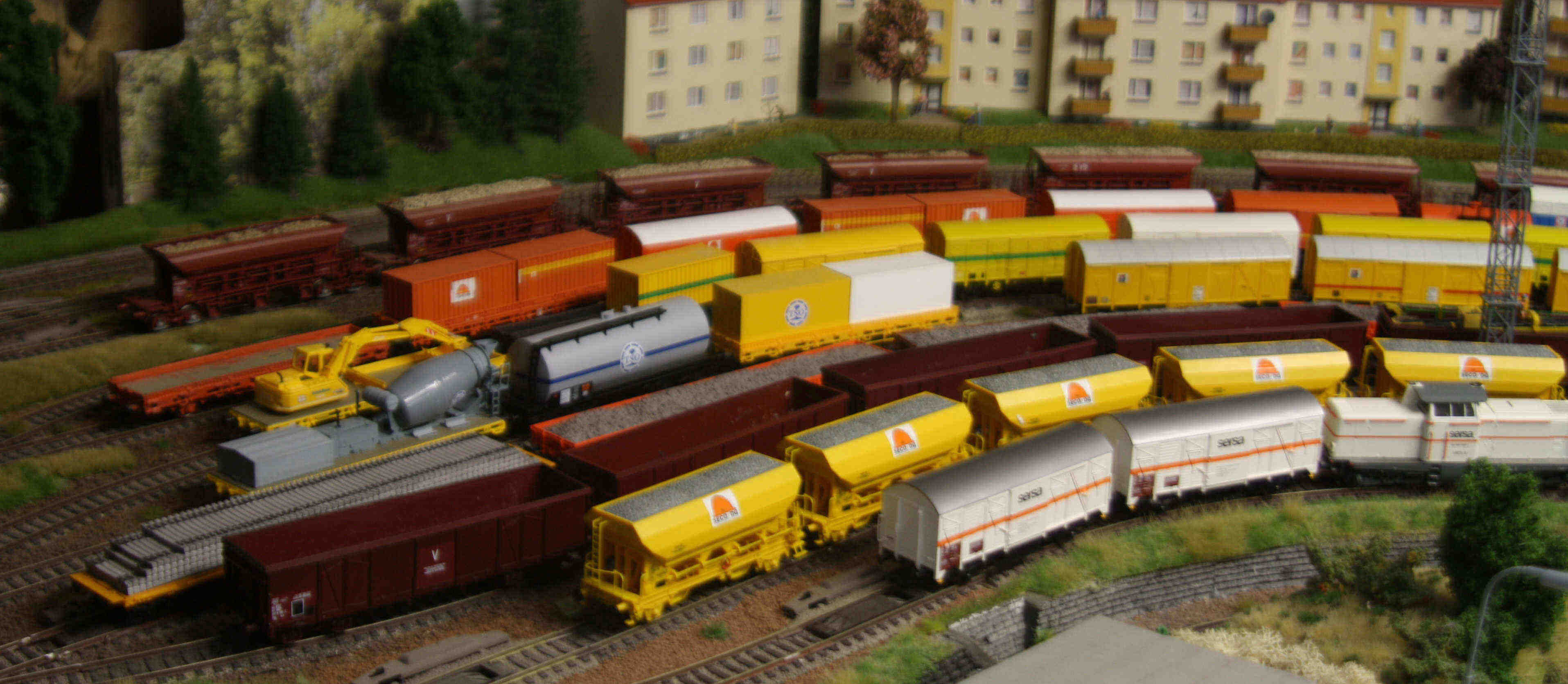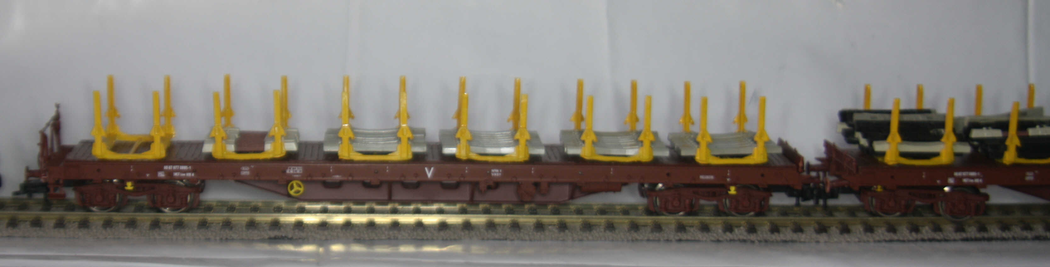 Les wagons plats sont des Piko (54827) sans leur chargement d'origine, le tombereau vient de chez Klein-Modellbahn (5322). le petit wagon jaune (Kibri) sert d'espacement et d'interface entre 2 types d'attelages.