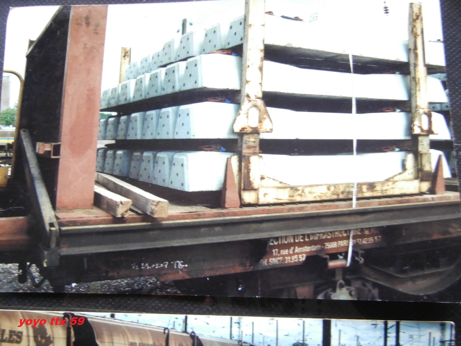 Voici l'une de mes réalisations purement imaginaire , sauf pour le chargement qui lui est bien réel(d'aprés photos).La base du wagon est d'origine Sai(Kibri).Les traverses proviennent de la voie traverses beton code 83 de chez Roco "ref:42401".