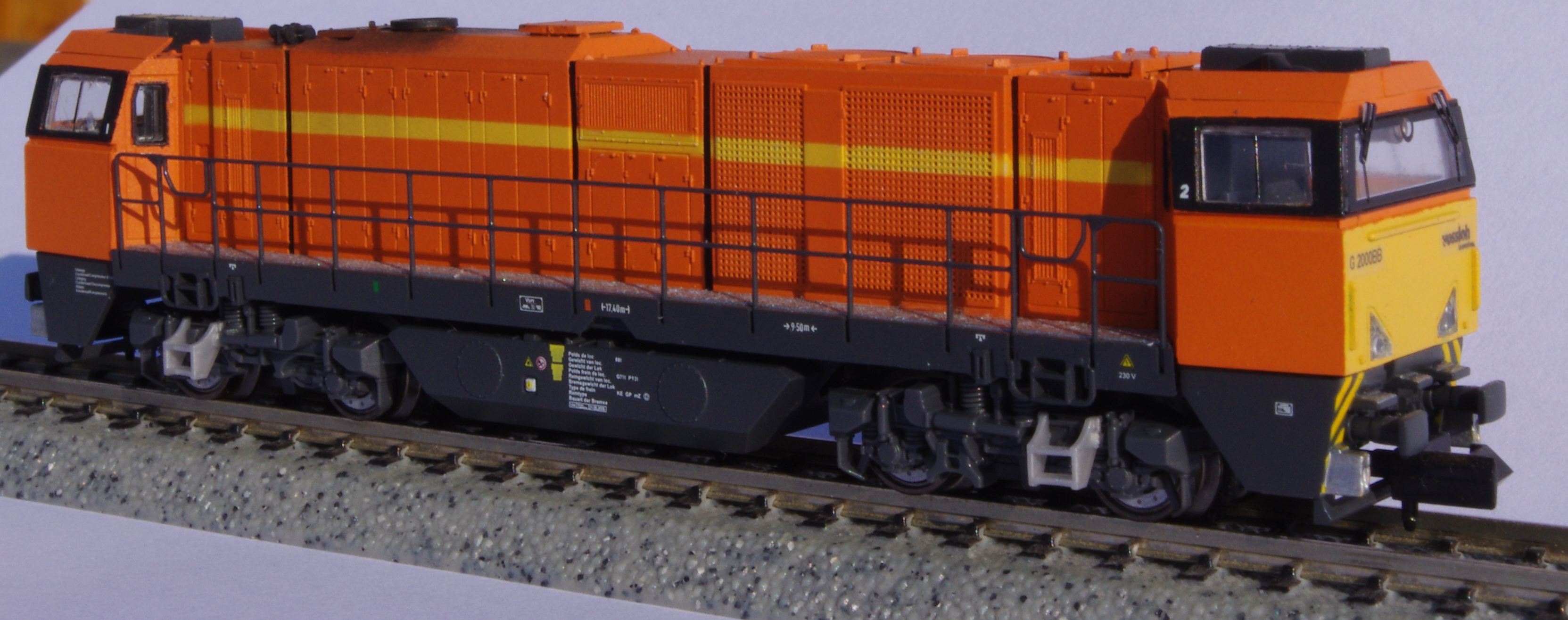 Voici une G2000 Méhano à l'échelle N redécorée aux couleurs de Colas-Rail.