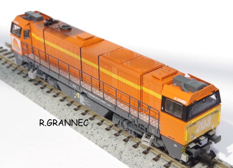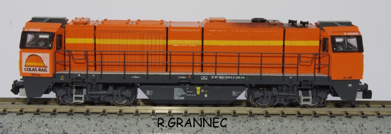 Voici une G2000 Méhano à l'échelle N redécorée aux couleurs de Colas-Rail.