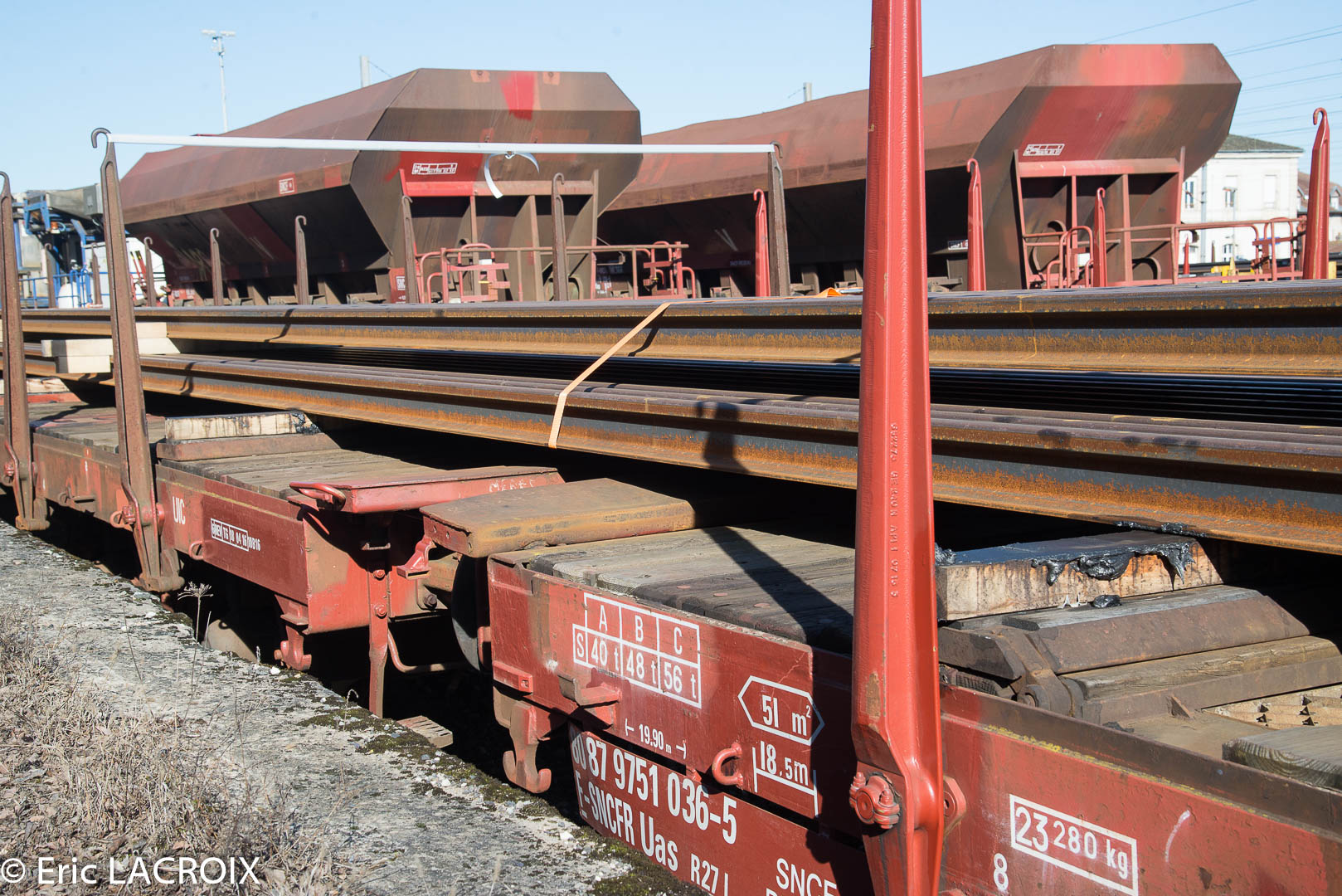 Wagon transport de rails courts R27 Uas 80 87 9751 036-5 SNCF R à Chalindrey en février 2019.