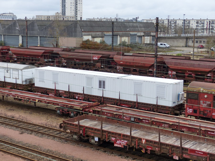 - 80 87 979 4 795-5 Uas R55 6 F-SNCFR - NT (wagon plat à bogies avec bungalow) sous le pont