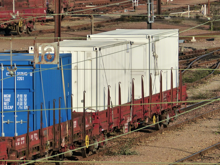 Voici le wagon plat à boggies 80 87 979 4 750-0 Uas R55 6 - F SNCF-TR gare d'attache Saint Pierre des Corps - porte bungalow