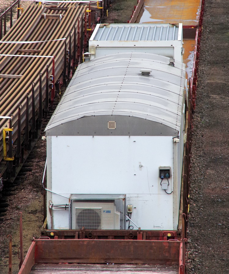 - 80 87 979 4 795-5 Uas R55 6 F-SNCFR - NT (wagon plat à bogies avec bungalow) sous le pont