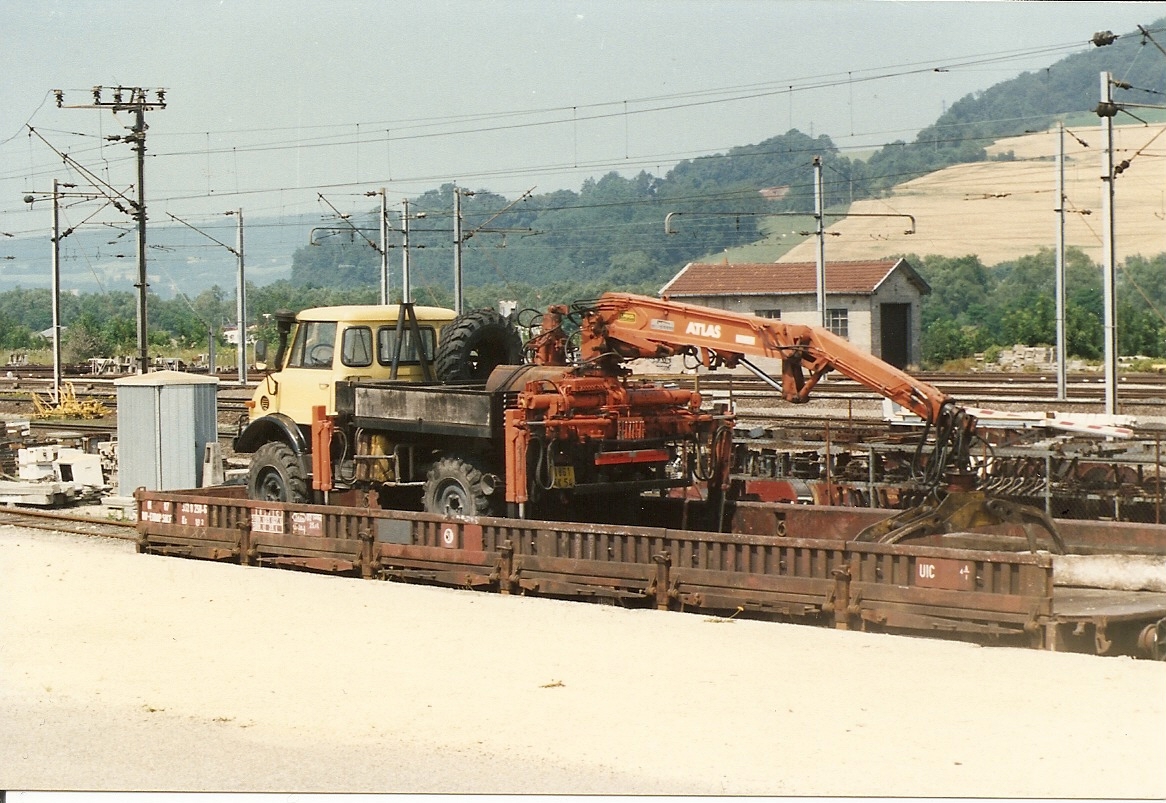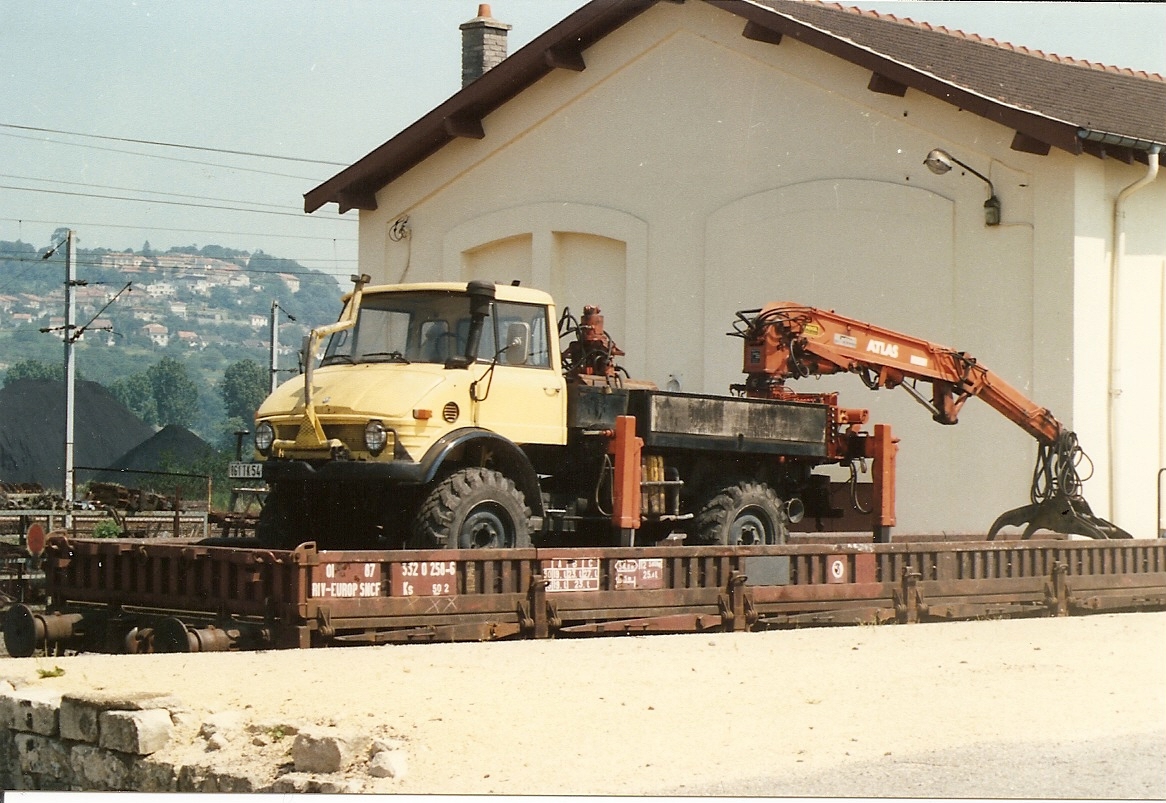 voici deux photos d'un plat Ks 332 0 250-6 chargé d'un unimog equipé d'une grue ATLAS