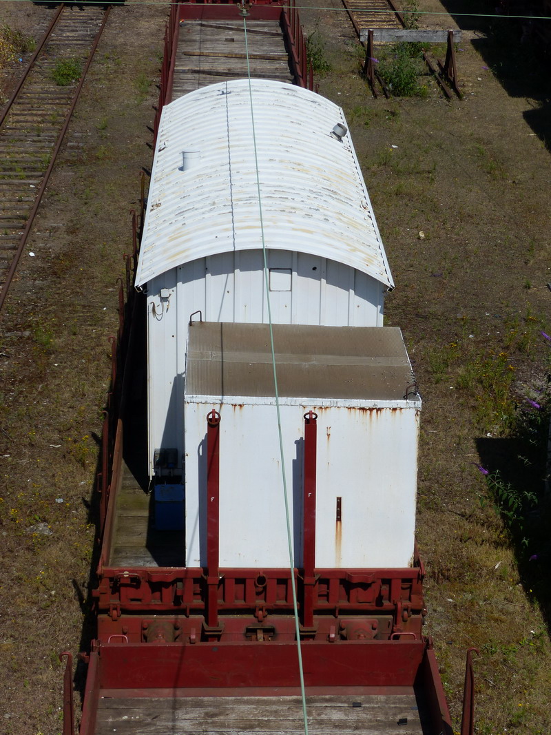 Voici le wagon plat à essieux 40 87 959 4 599-2 Us K55 1 F SNCF-CF Point d'attache Clermont-Ferrand avec un bungalow