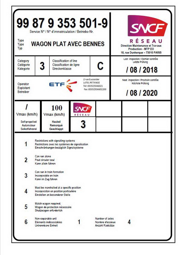 Voici l'Agrément pour le wagon plat R680 avec bennes pour le train PUSCAL d(ETF