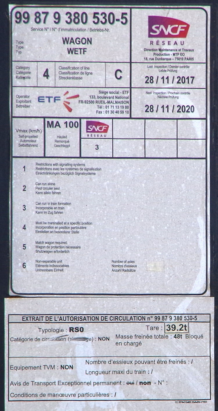 99 87 9 380 530-5 wagon WETF PK 20,077 voie 2 à Marcelcave (80) sur le train n°MCK1 de la Coupe ETF le 04 juin 2018