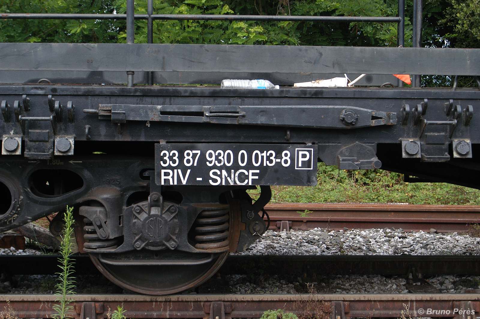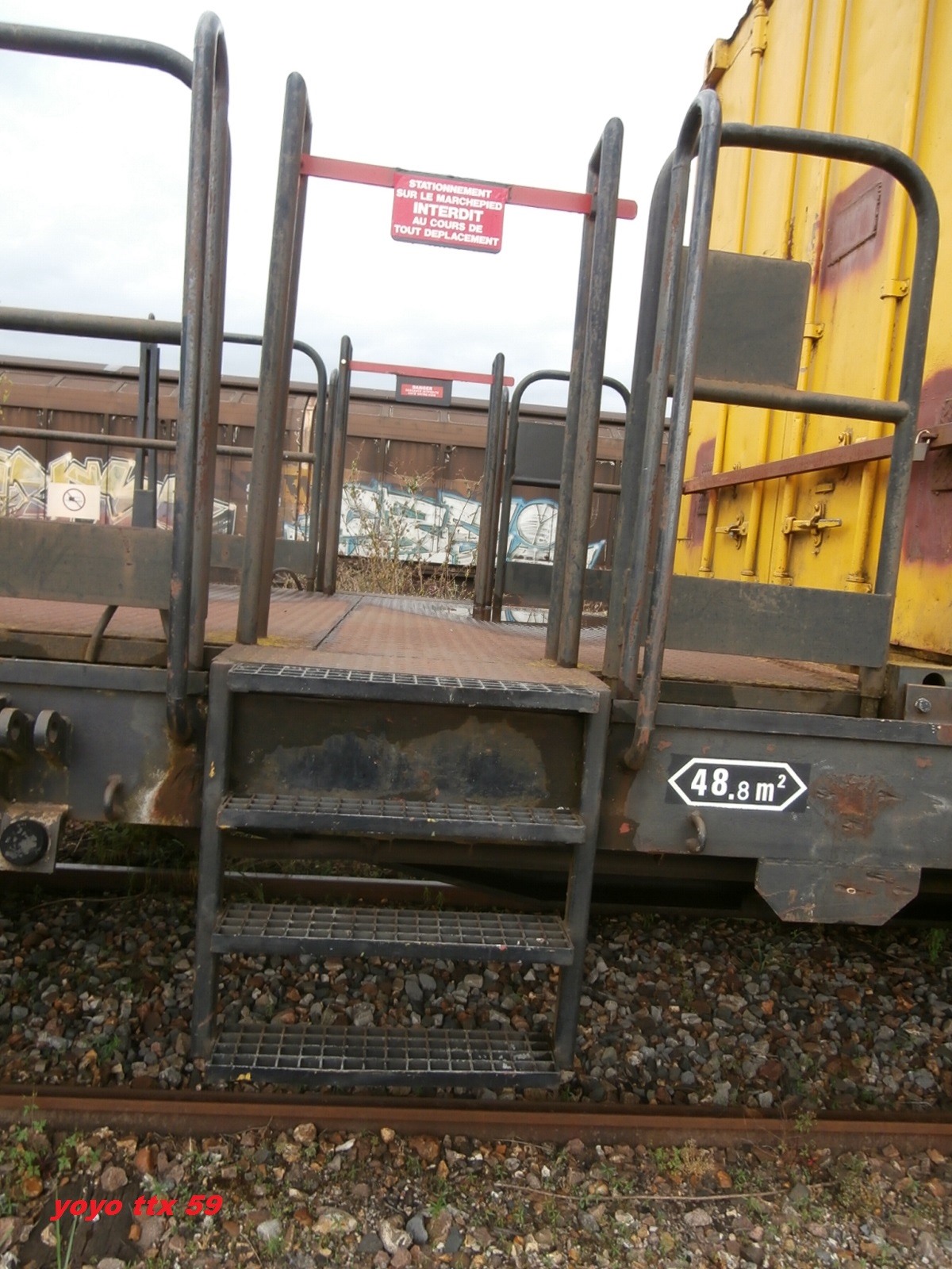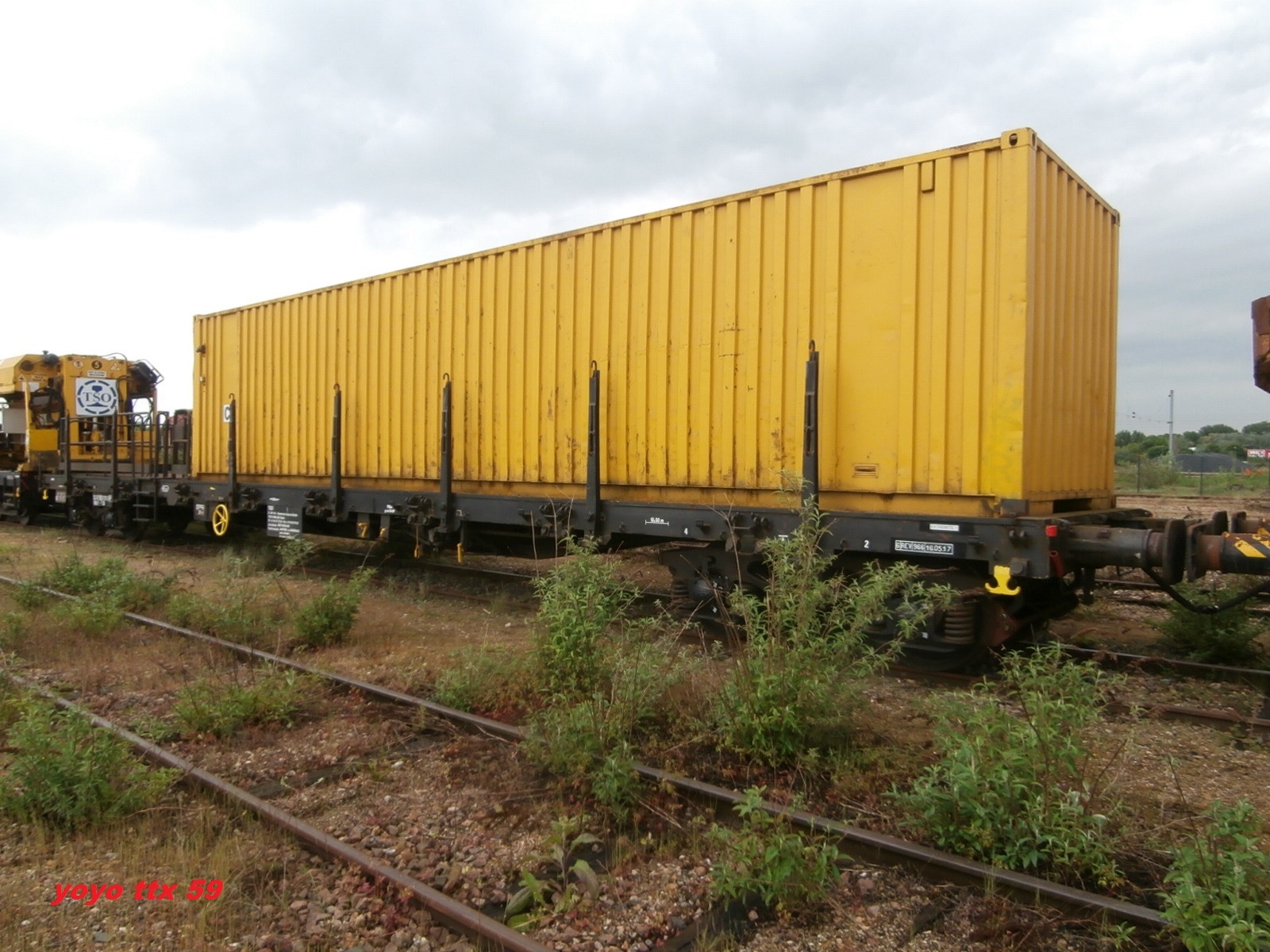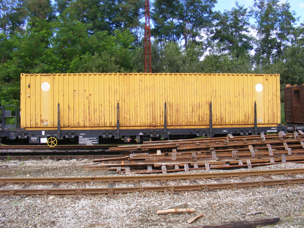 un plat immatriculé "wagon de particulier", pratique courante chez TSO. A noter l'ancien logo TSO sur le container.