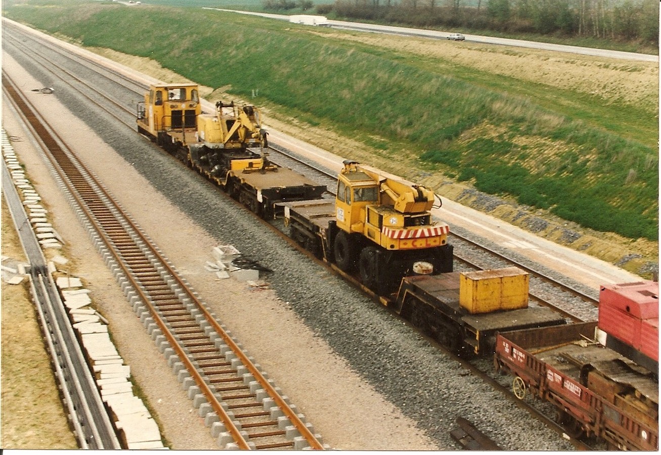 Voici donc la suite du convoi tracté par le loco CFD TSO: deux surbaissés chargés de grues et un K 50 chargé d'une pelle POCLAIN