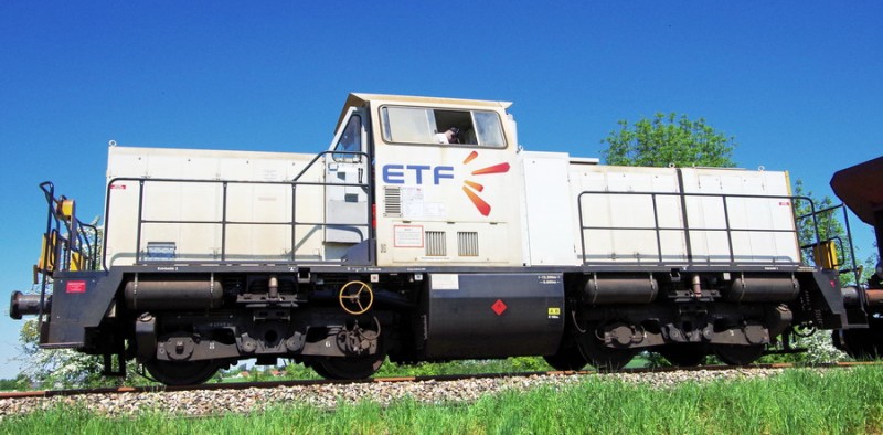 La voici entre la gare de Jussy et les ponts de Bray (02) sur une rame de TTX pour la finition sur le RVB Amiens Laon