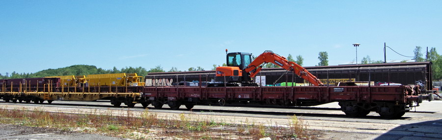 Le wagon 33 87 3945 062-9 Res RIV F-ERSA - ERMEWA avec une Pelle à chenille DOOSAN DX85R pour Transalp remouvellement