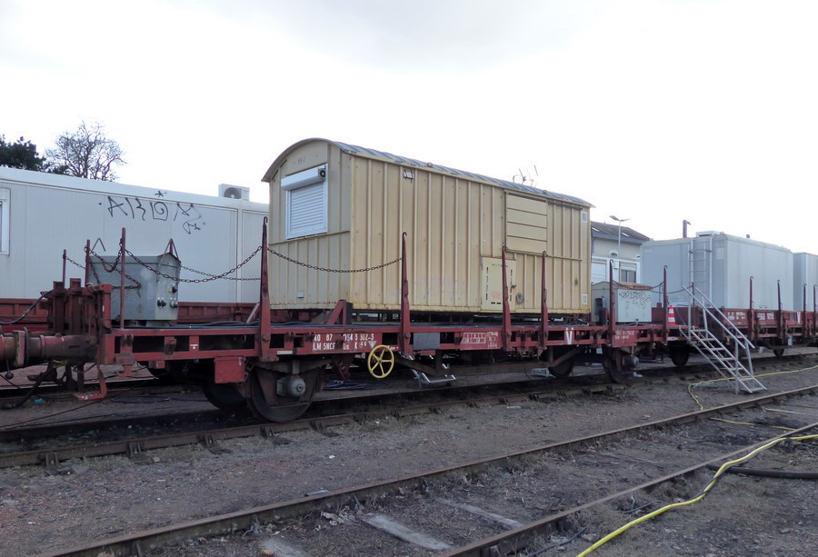 Voici le wagon plat à essieux 40 87 954 3 302-3 Us Type K 54 6 - F SNCF-LM - Point d'attache ELRE Limoges avec bungalow