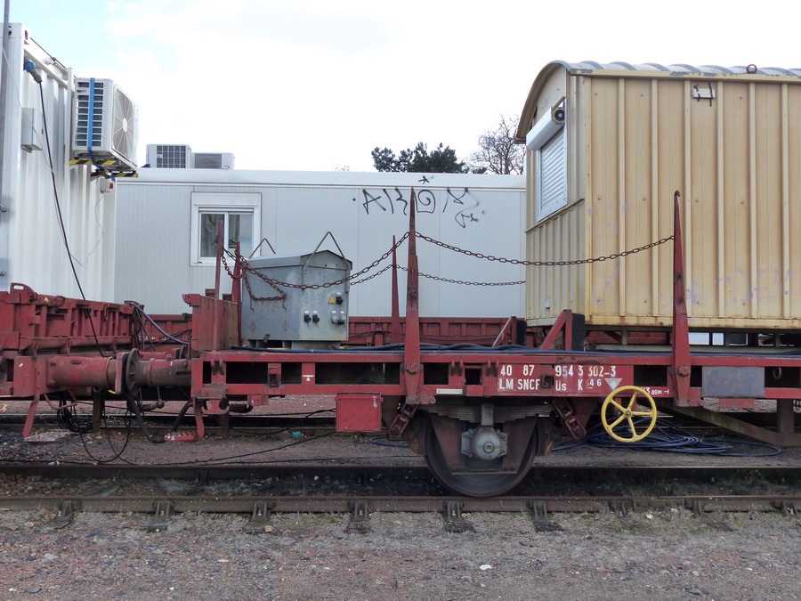 Voici le wagon plat à essieux 40 87 954 3 302-3 Us Type K 54 6 - F SNCF-LM - Point d'attache ELRE Limoges avec bungalow