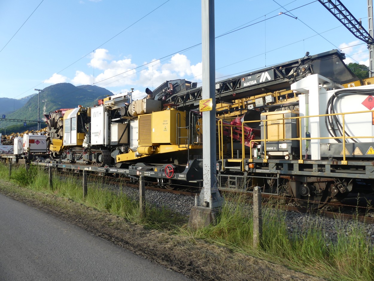 Voici la cribleuse W1+ de Rombherg Sersa Rail Group. Cette machine sur chenille roule également sur rails grâce à des bogies relevables. Elle est transportée sur un wagon surbaissé.