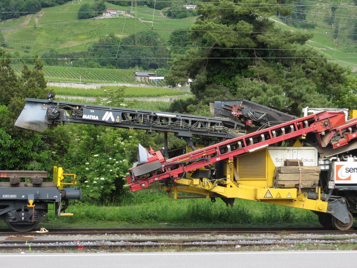 La grande roue creuse le ballast qui est transporté sur un wagon spécial qui contient le crible et évacue le ballast usagé. le ballast exploitable revient via un tapis et se dépose via l’entonnoir rouge.