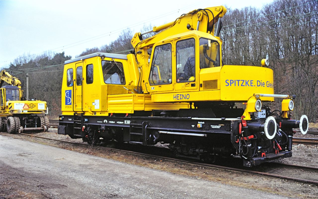 OBW 10 : Draisine lourde pour l’entretien de la voie, avec surface de chargement et grue spécifique avec nacelle, notamment adaptée à l’inspection des ouvrages d’art/ponts.