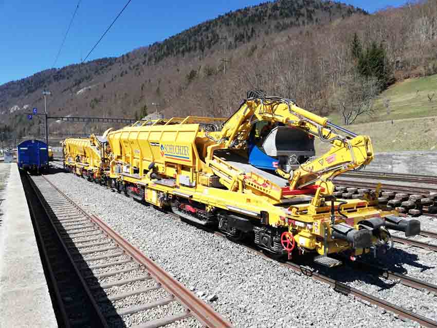 Scheuchzer vient d'acquérir un ensemble de MFS sur chenille, un des MFS est équipé d'une pelleteuse permettant le terrassement de la plateforme et le chargement direct sur MFS, le second MFS sert de tampon en celui de creuse et ceux de voie