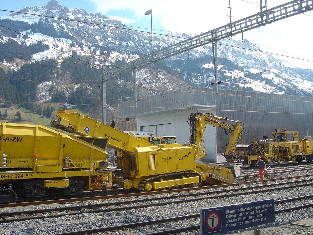 Voici l'un des Vanoliner de l'entreprise Vanoli. Cette machine rail/route montée sur chenille est utilisé lors de réfection pour la creuse et l'excavation des matériaux chargé ensuite dans des VAD dont certains sont sur chenille. Le Vanoliner est transporté sur un wagons surbaissé.