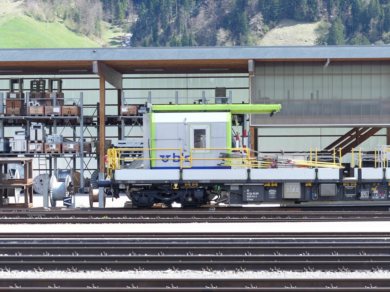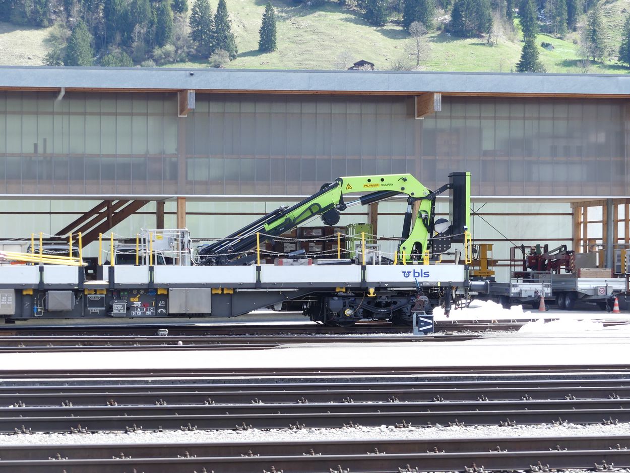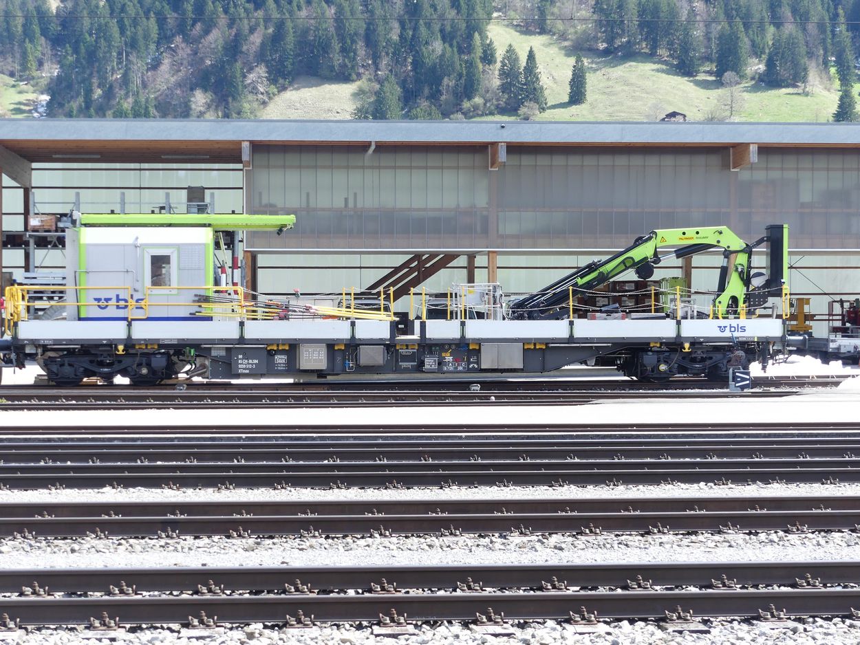 Voici un wagon grue/nacelle avec un petit atelier dans un conteneur avec une plateforme sur le toit.