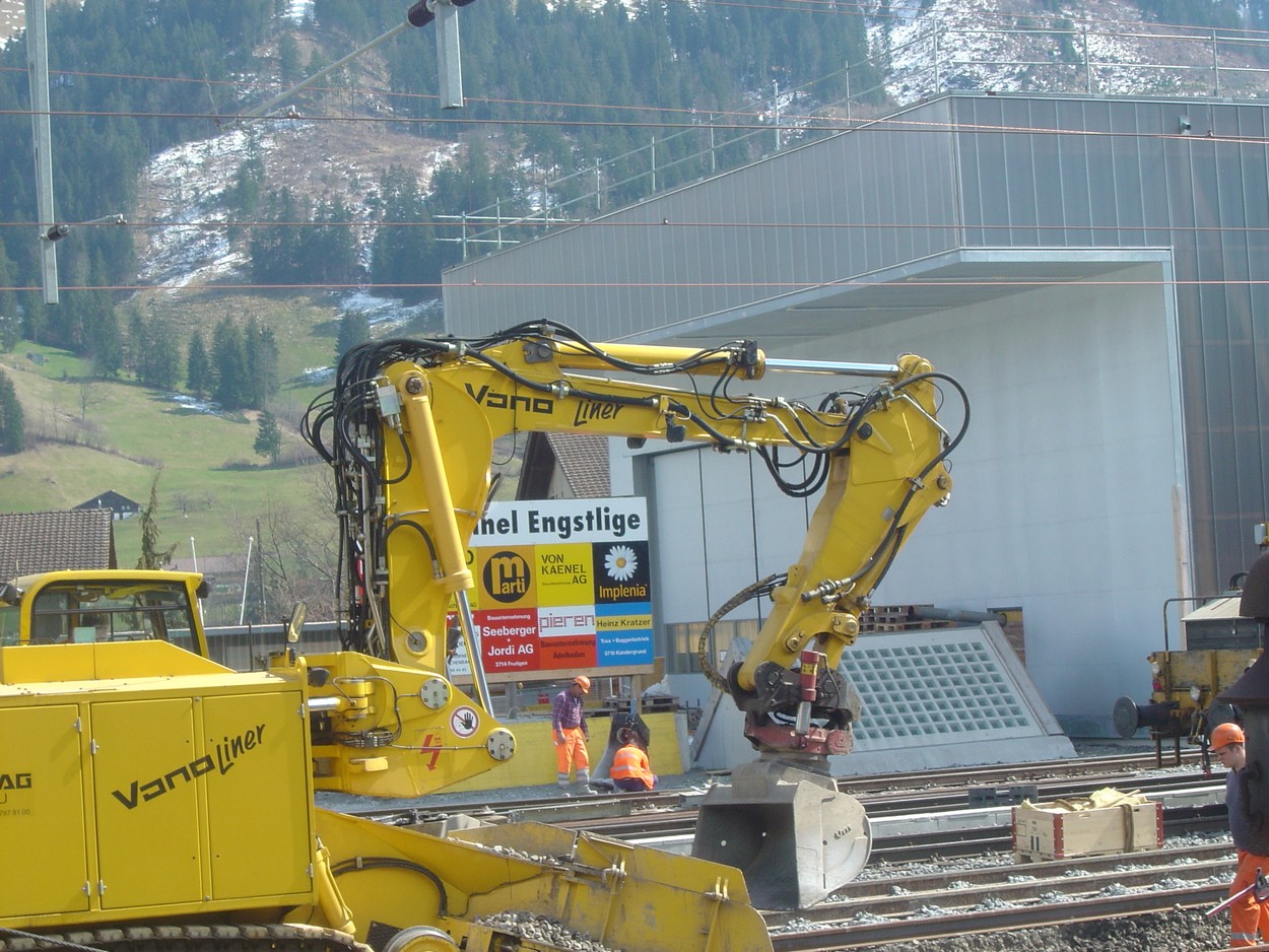 Voici l'un des Vanoliner de l'entreprise Vanoli. Cette machine rail/route montée sur chenille est utilisé lors de réfection pour la creuse et l'excavation des matériaux chargé ensuite dans des VAD dont certains sont sur chenille. Le Vanoliner est transporté sur un wagons surbaissé.