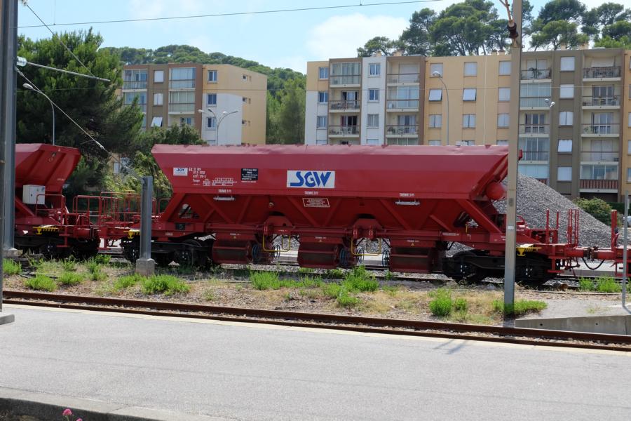 Wagon trémie présent en gare de Hyères le 9 septembre 2014 dans une rame de 10 wagons.