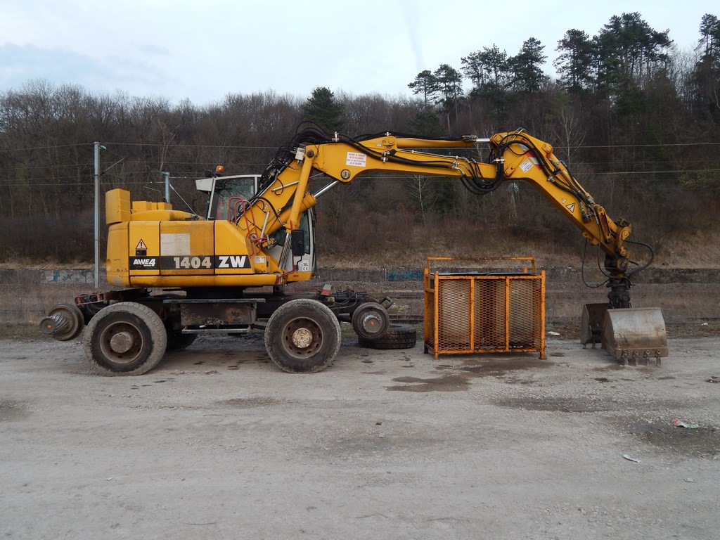 avec la vue sur l'autre Pelle Rail route Atlas 1404 ZW AW4 n°241Z301683 de Fouchard & Renard le 26 juin 2018 au niveau