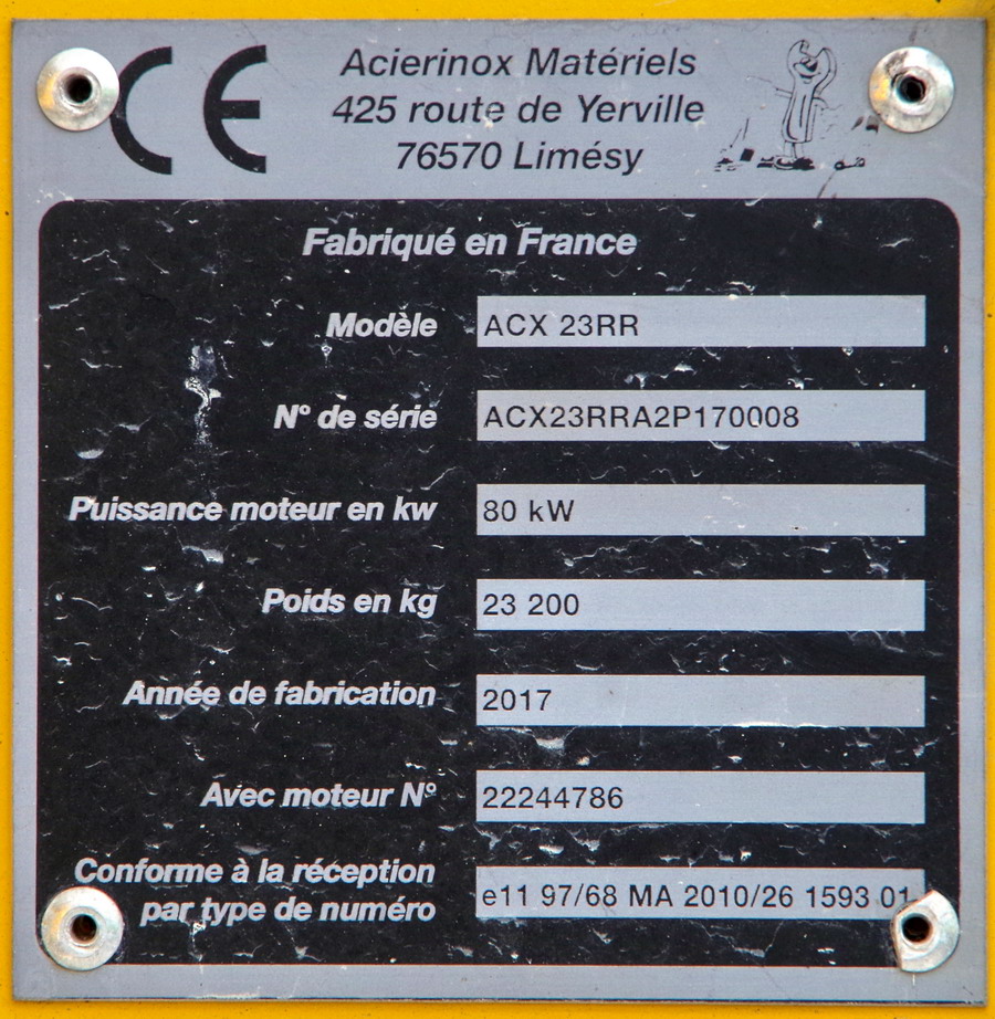 ACX 23 RR n°ACW23RRA2P170008 de 2017 n° moteur 22244786 Agrément de travail MTP 17 282 - 27-10-2022