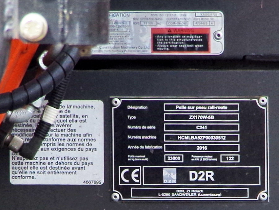 Pelle Rail route D2R de type ZX170W-5B n°HCMLBA5ZP00030512 série C241 de 2016 pour CLMTP