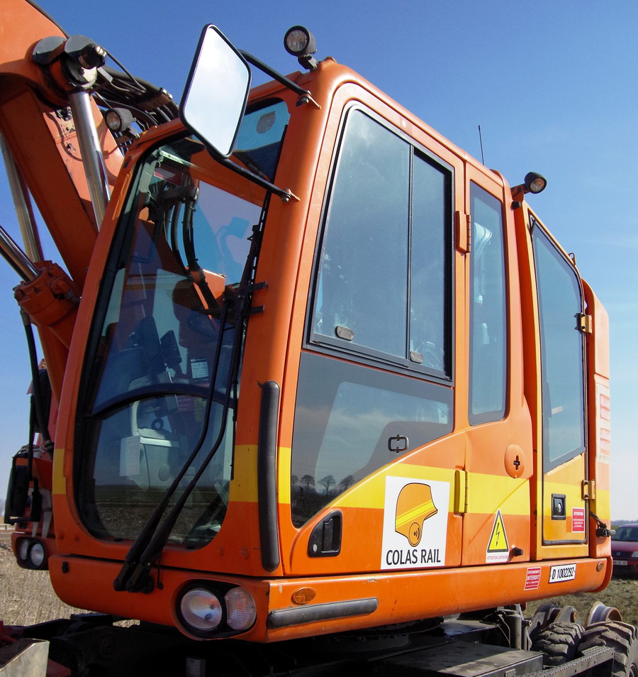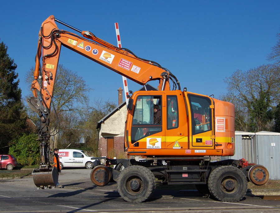 la Pelle Rail-route va se mettre sur les rails elle profite du passage a niveau pour se mettre sur les rail puis elle part sur la zone de chantier
