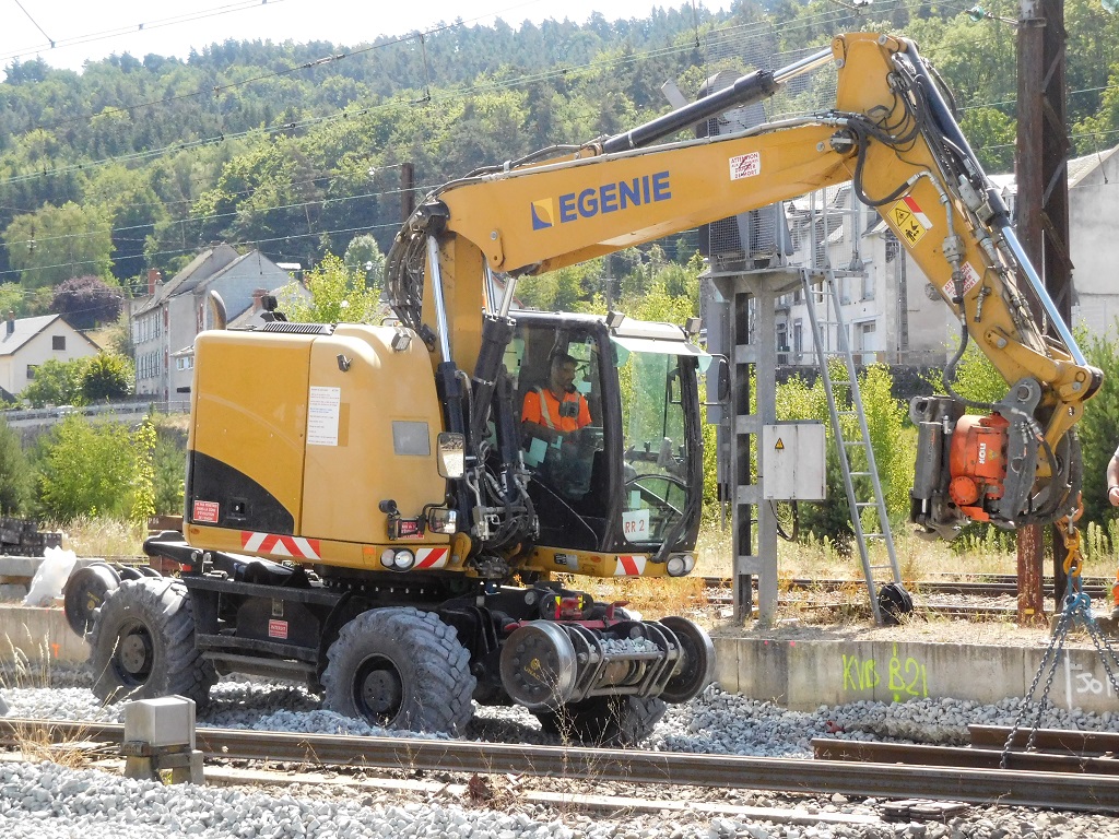 Voici un pelle RR appartenant à la société E-génie croisée en gare de Neussargues dans le cadre des travaux du CPER Aurillac-Arvant en Juillet 2022 :