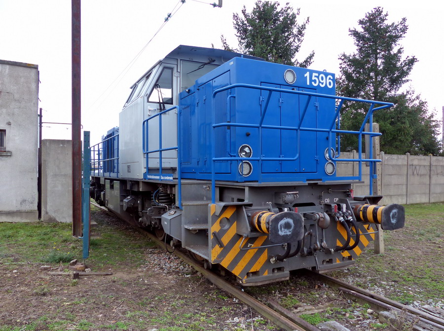 Ce jeudi 3 juin 2021 en fin de matinée, la machine 1596 en livrée bleue et cabine blanche (n° 92 87 0 001 032 7) était sur le faisceau de Tulle (Corrèze) attelée sur une rame de wagons Uas (plats à bogies) chargés de longs rails.