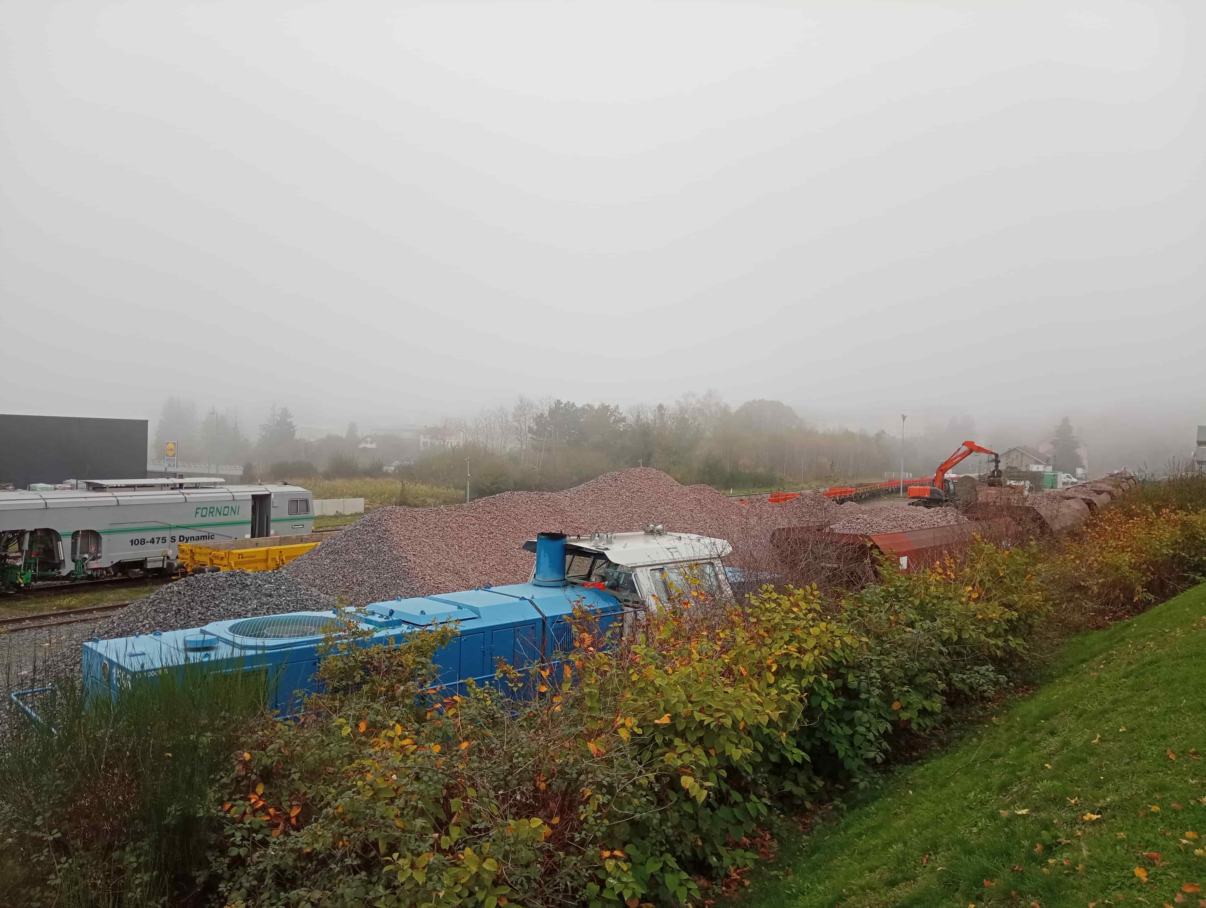 Sur la zone de travaux de la gare de Bruyères (88) lors de travaux de rénovation entre Arches et St-Dié-des-Vosges, novembre 2024.