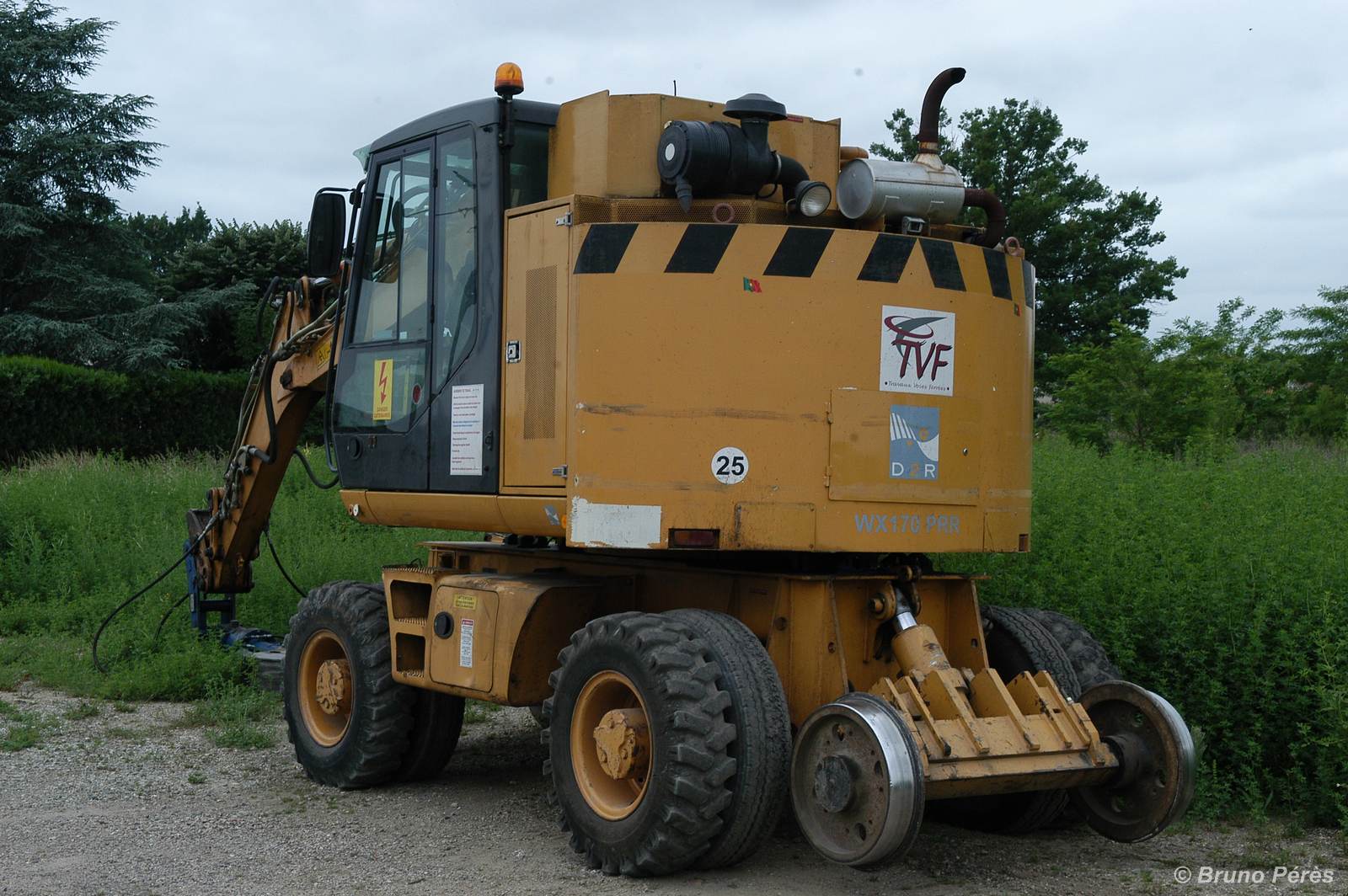 Machine vu à Laluque (40) pour le chantier de construction de la base travaux (environ 15 hectares) de la ligne Bordeaux - Irun, j'ai également aperçu du matériel Avenel, GVF et SNCF.