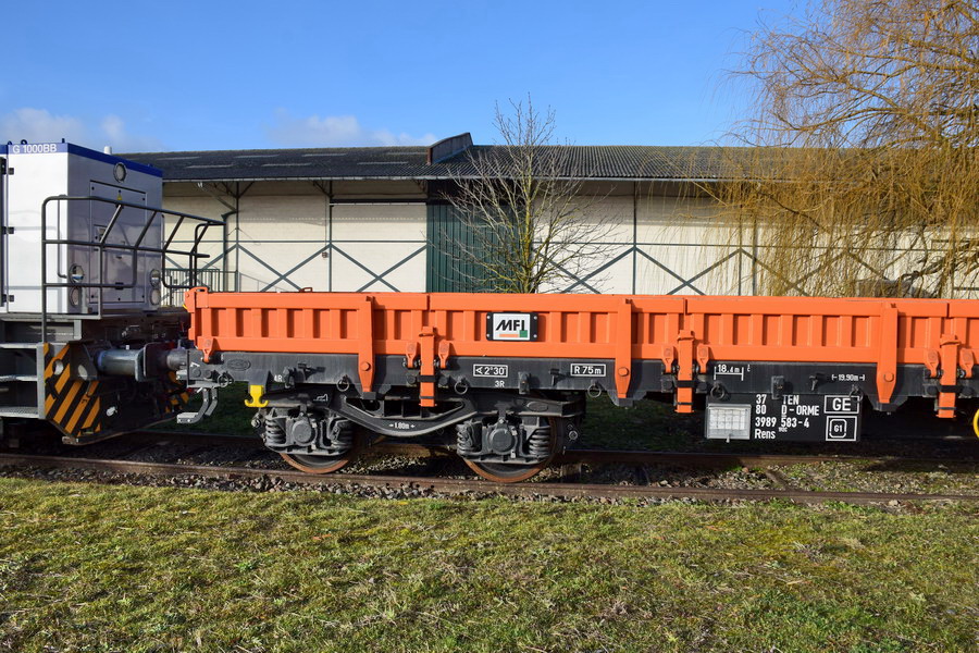 Voici le wagon 37 80 3989 583-4 Rens 192 C - TEN RIV D-ORME de la société On Rail Gmbh (Allemagne) pour la société de location de wagons M.F.I sa (Matériel Ferroviaire et Industriel) de Strasbourg qui est une société spécialisée dans l'achat-vente, la location,