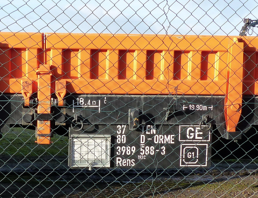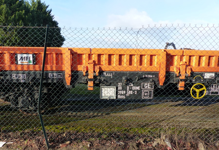 Voici le wagon 37 80 3989 588-3 Rens 192 C - TEN RIV D-ORME de la société On Rail Gmbh (Allemagne) pour la société de location de wagons M.F.I sa (Matériel Ferroviaire et Industriel) de Strasbourg qui est une société spécialisée dans l'achat-vente, la location,