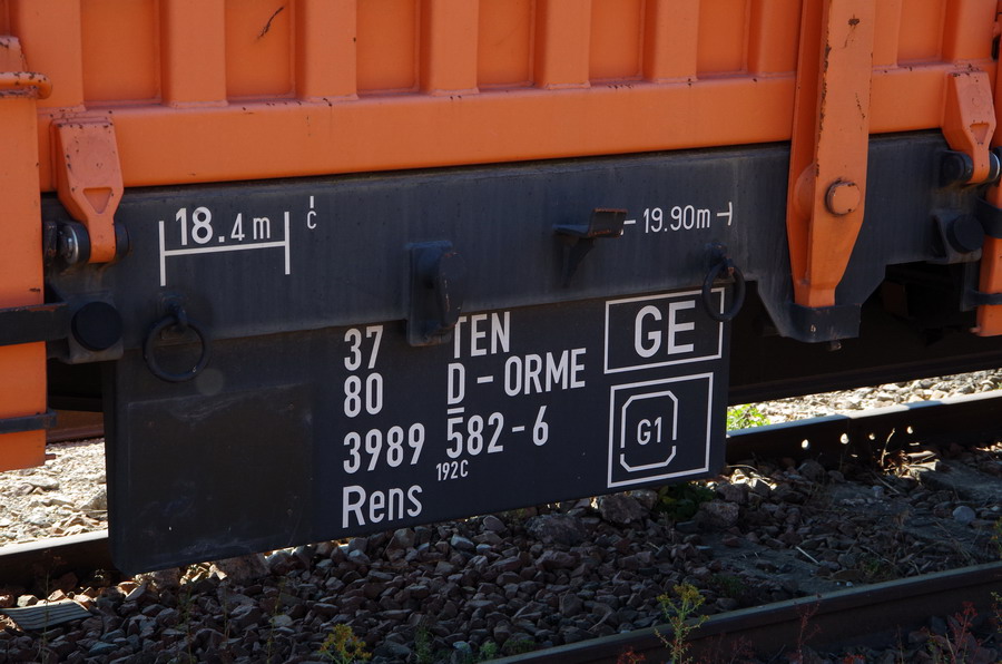 Voici le wagon 37 80 3989 582-6 Rens 192 C - TEN RIV D-ORME de la société On Rail Gmbh (Allemagne) pour la société de location de wagons M.F.I sa (Matériel Ferroviaire et Industriel) de Strasbourg qui est une société spécialisée dans l'achat-vente, la location,