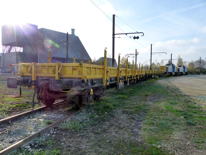 Voici un wagon plat de la société On Rail GmbH (Allemagne) en location pour Ferrotract sur une rame avec 4 autres wagons de la société M.F.I de Strasbourg en location aussi pour eux