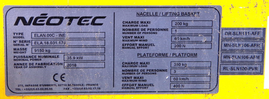 NEOTEC ELAN 00C - INE n°ELA.18.031.170 de 2018 Agrément DPI 14 046 - TSO Caténaires NGE parc n°ELAN 178
