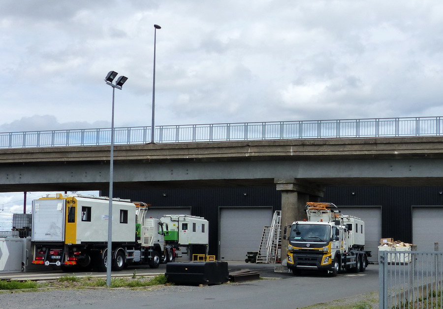 Les roues routières sont maintenues en position haute pour dégager le gabarit ferrroviaire bas, à contrario les rembardes pour travailler sur la caténaire LGV ont été levées.