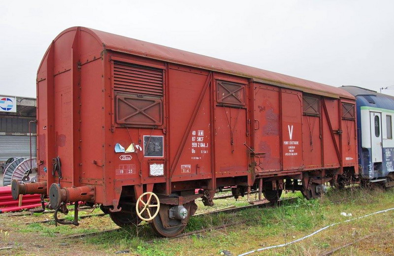 Voici le wagon 40 87 959 2 044-1 Us G54 1 SNCF-AM - Point d'attache Longueau (wagon atelier magasin)