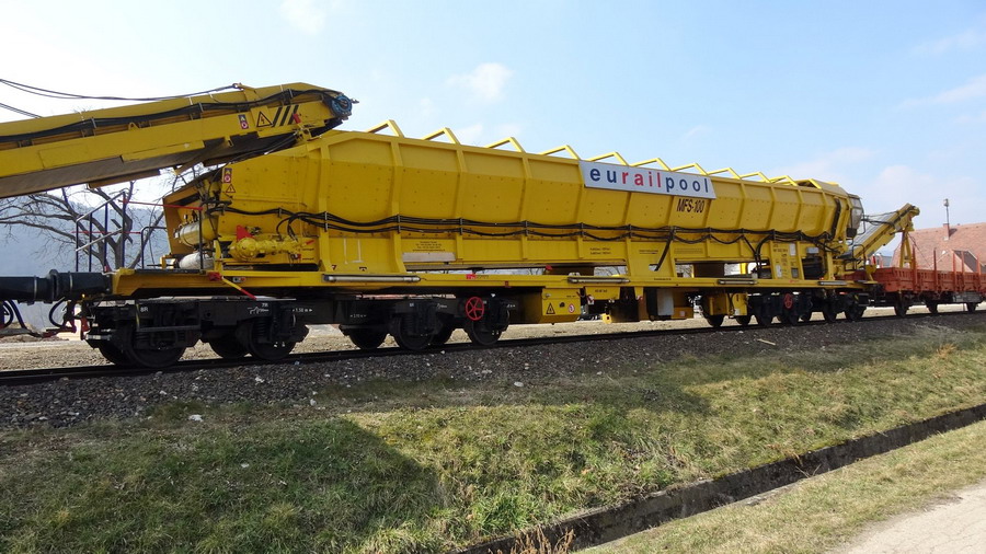6 wagons MFS 100 Wagon auto-stockeur et déchargeur Eurailpool à Wachau (A) le 25-03-2018
