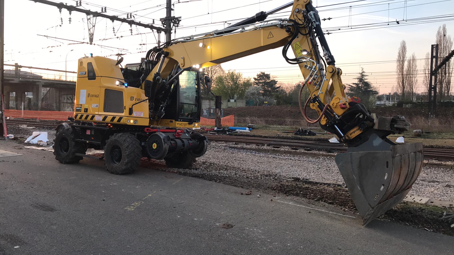 Cette pelle, pilotée par Alexandre, est sur un RAV Renouvellement Appareils de Voie à Trappes en avril 2022. (Sur les légendes précédentes, il faut lire avril 2023.)